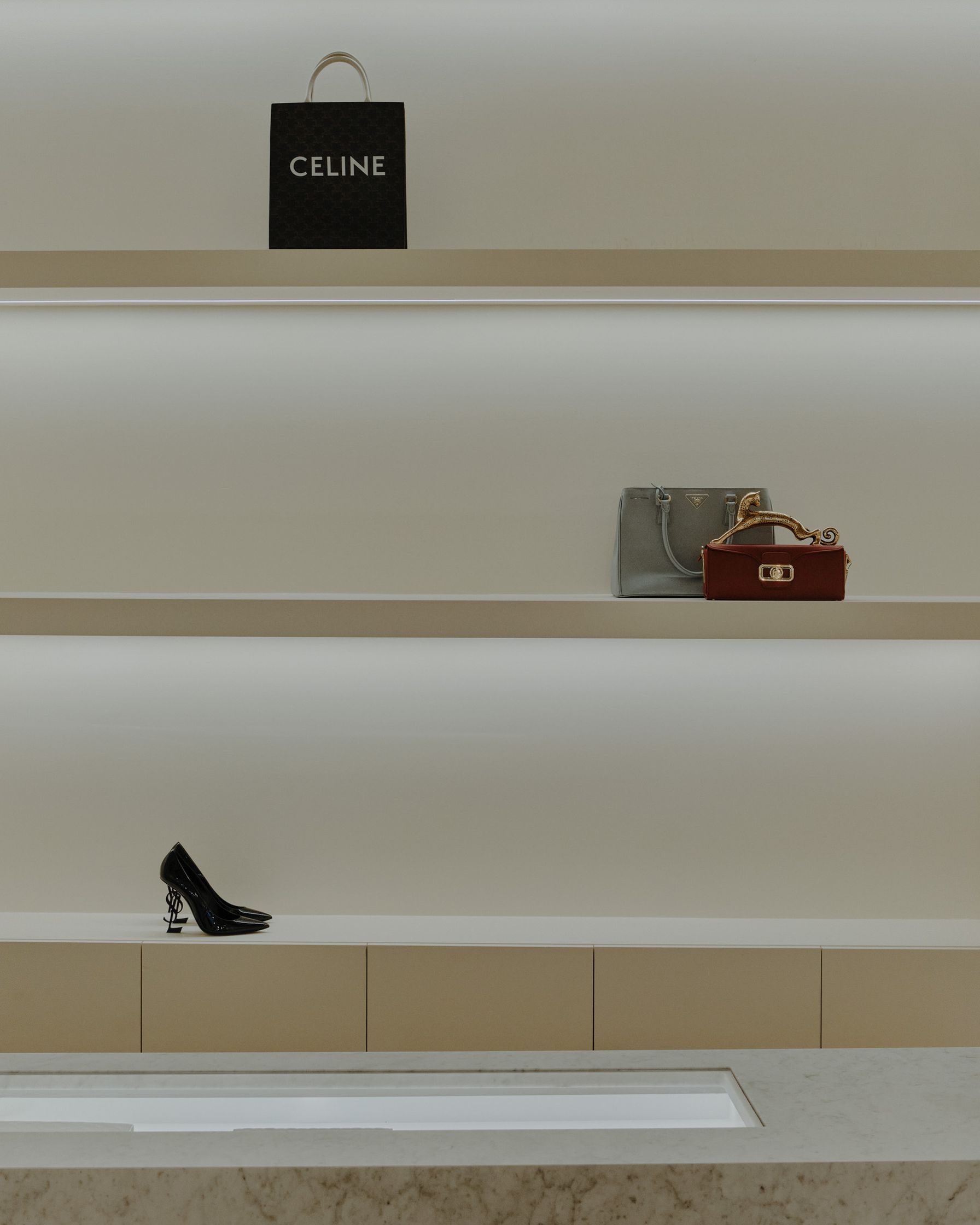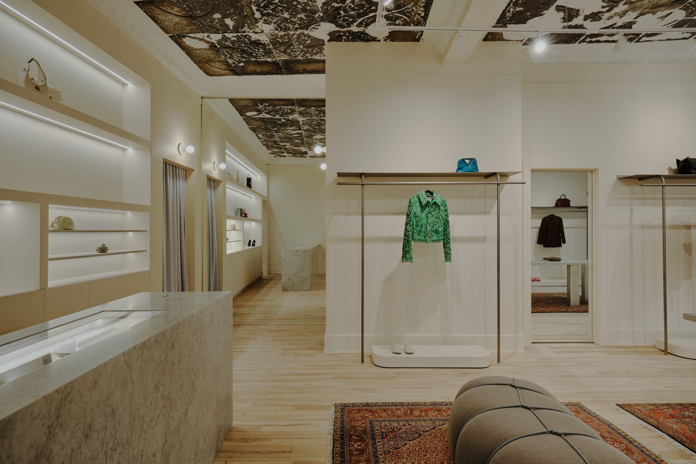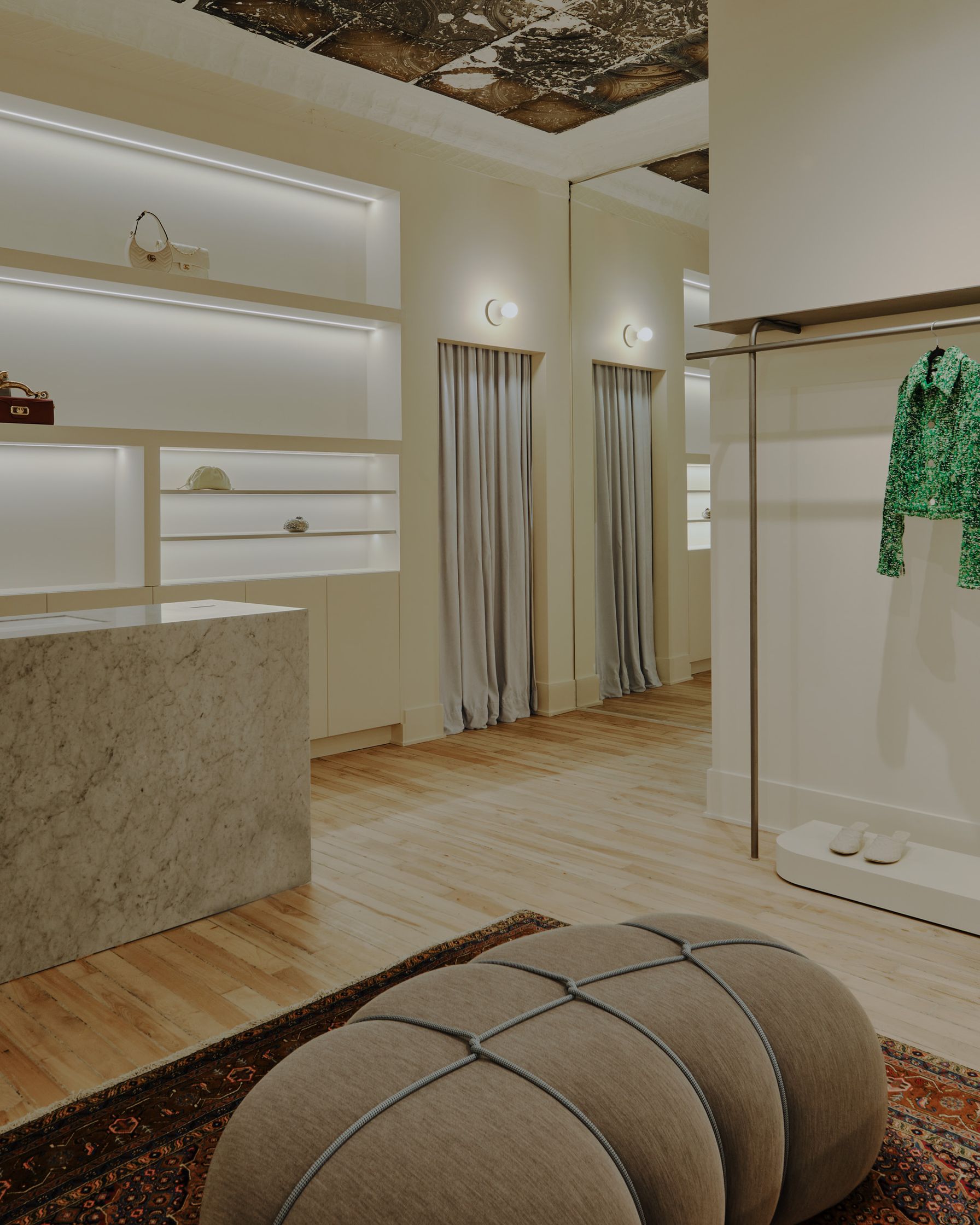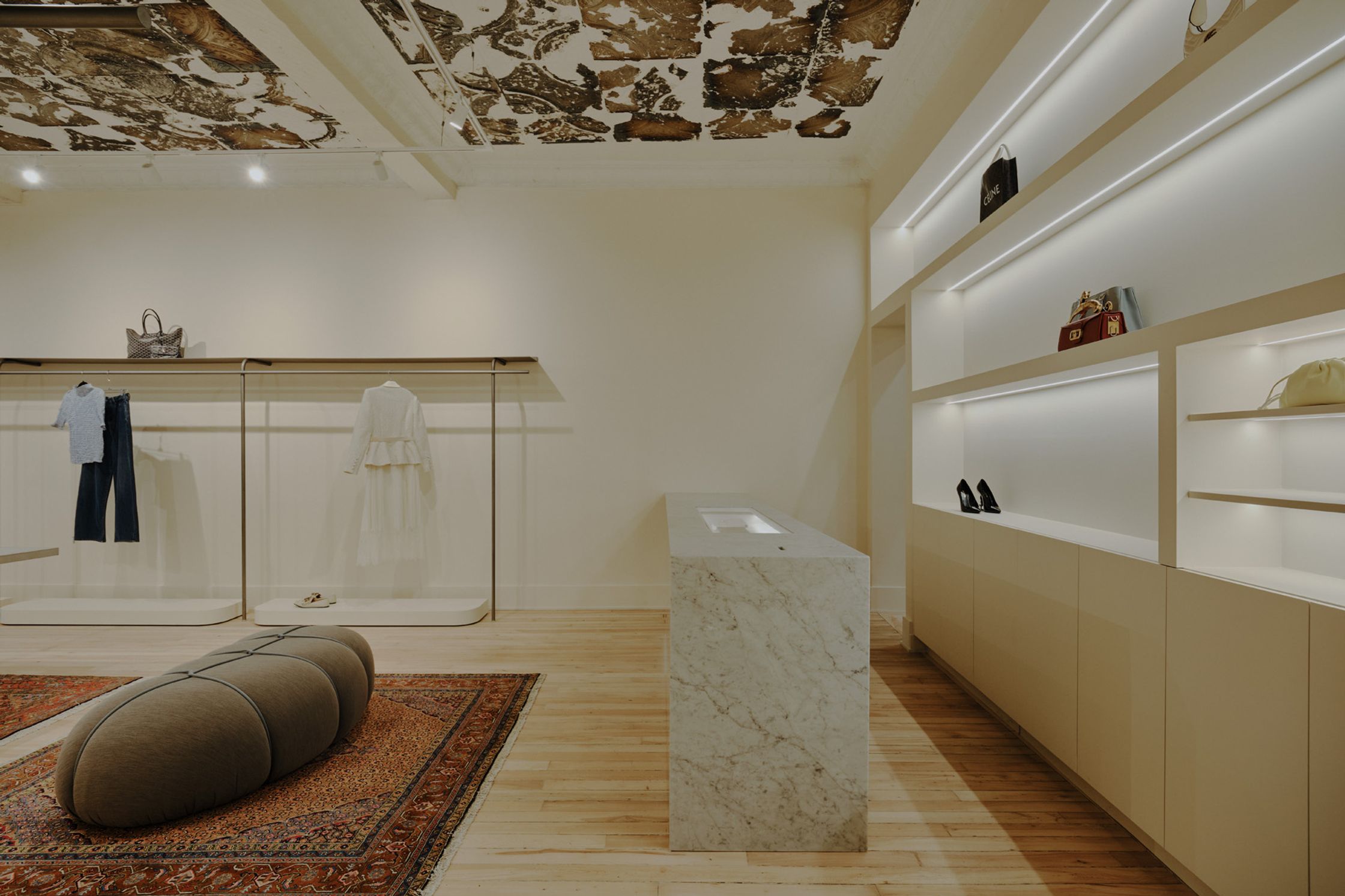 The design of Ruse Boutique was guided by the balance between past and present. The space was elevated while preserving its character: maple floors were sanded back to their natural tone, and decorative ceiling cornices retained. As a consignment shop, the challenge was to provide generous display without overwhelming the space. Tall, slender racks, strategically placed mirrors, and custom shelving with integrated lighting created the sense of openness and ease. Collaborations with local designers Clara Jorisch on a custom seating element and Justin Fusaro on the store's metal work grounded the project in craft and detail.