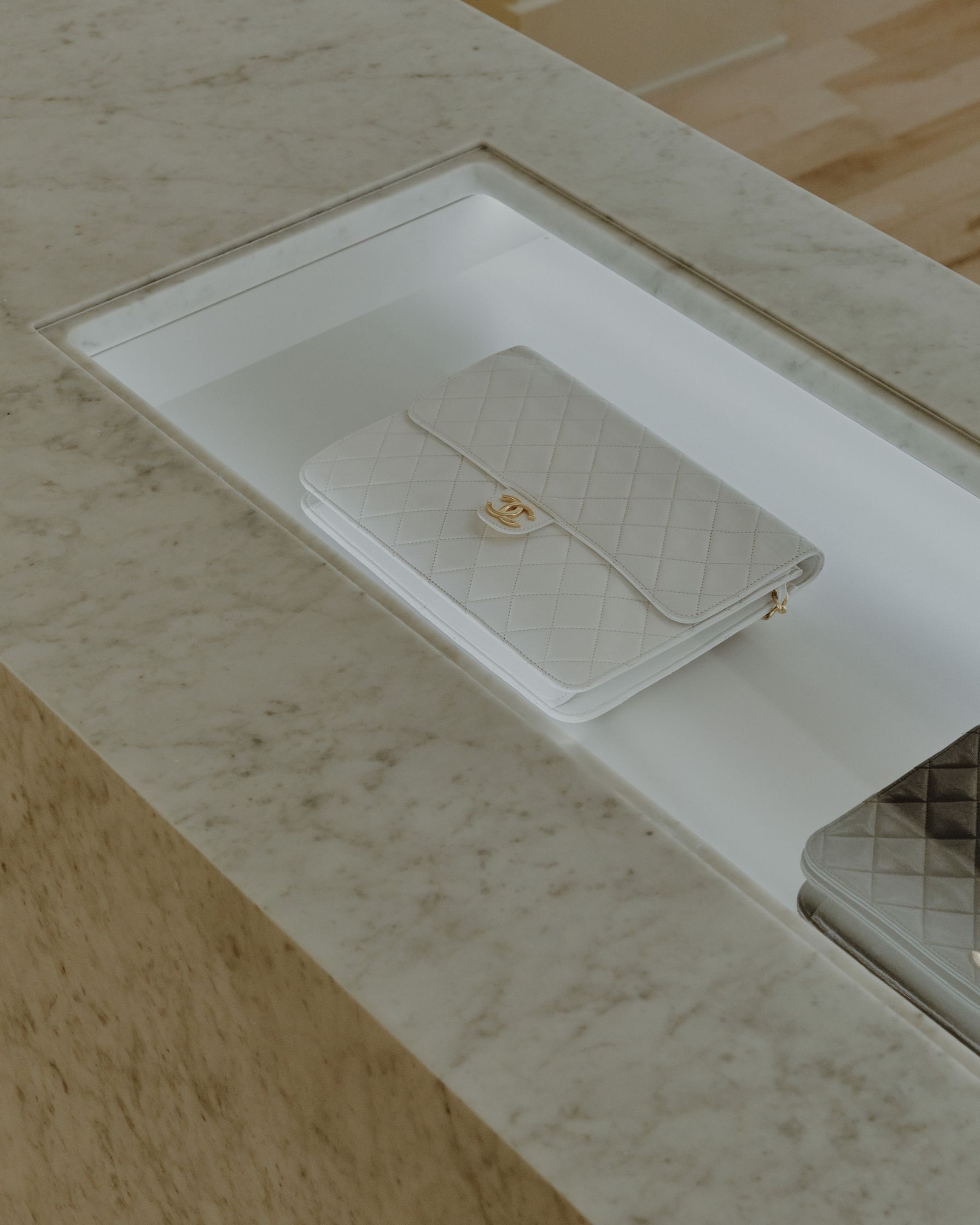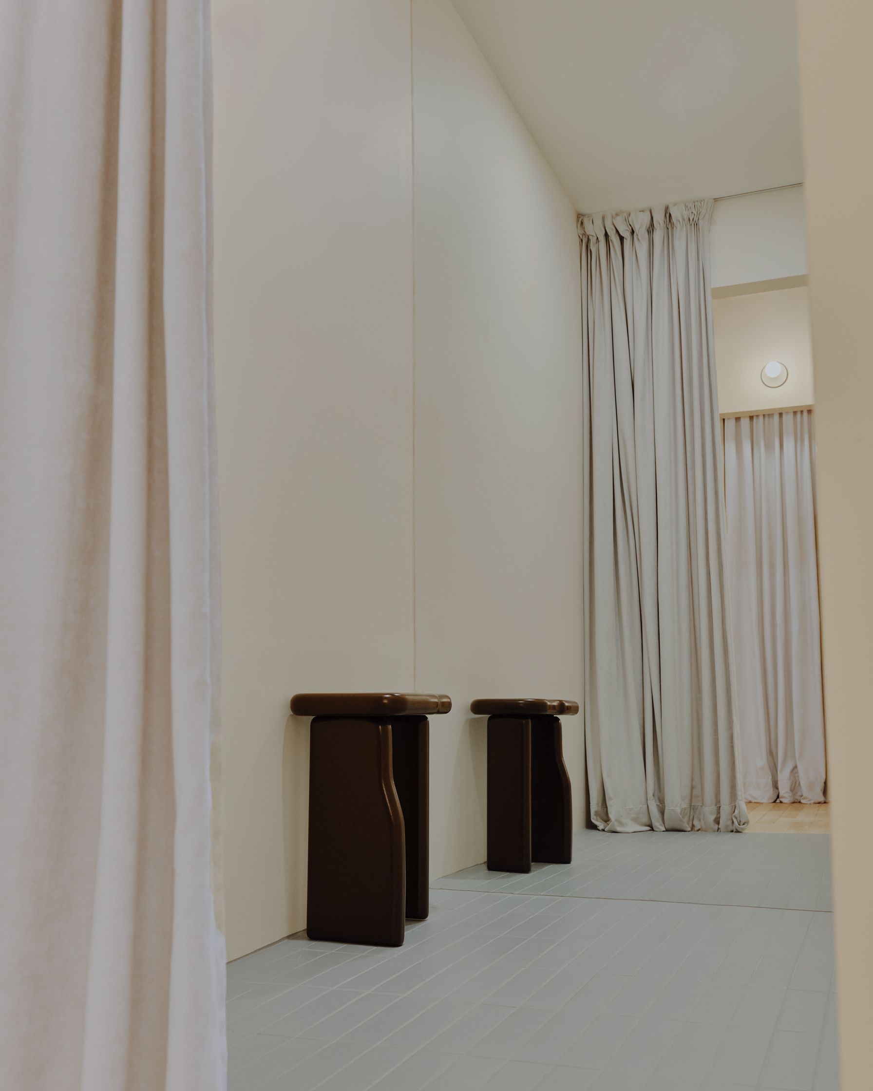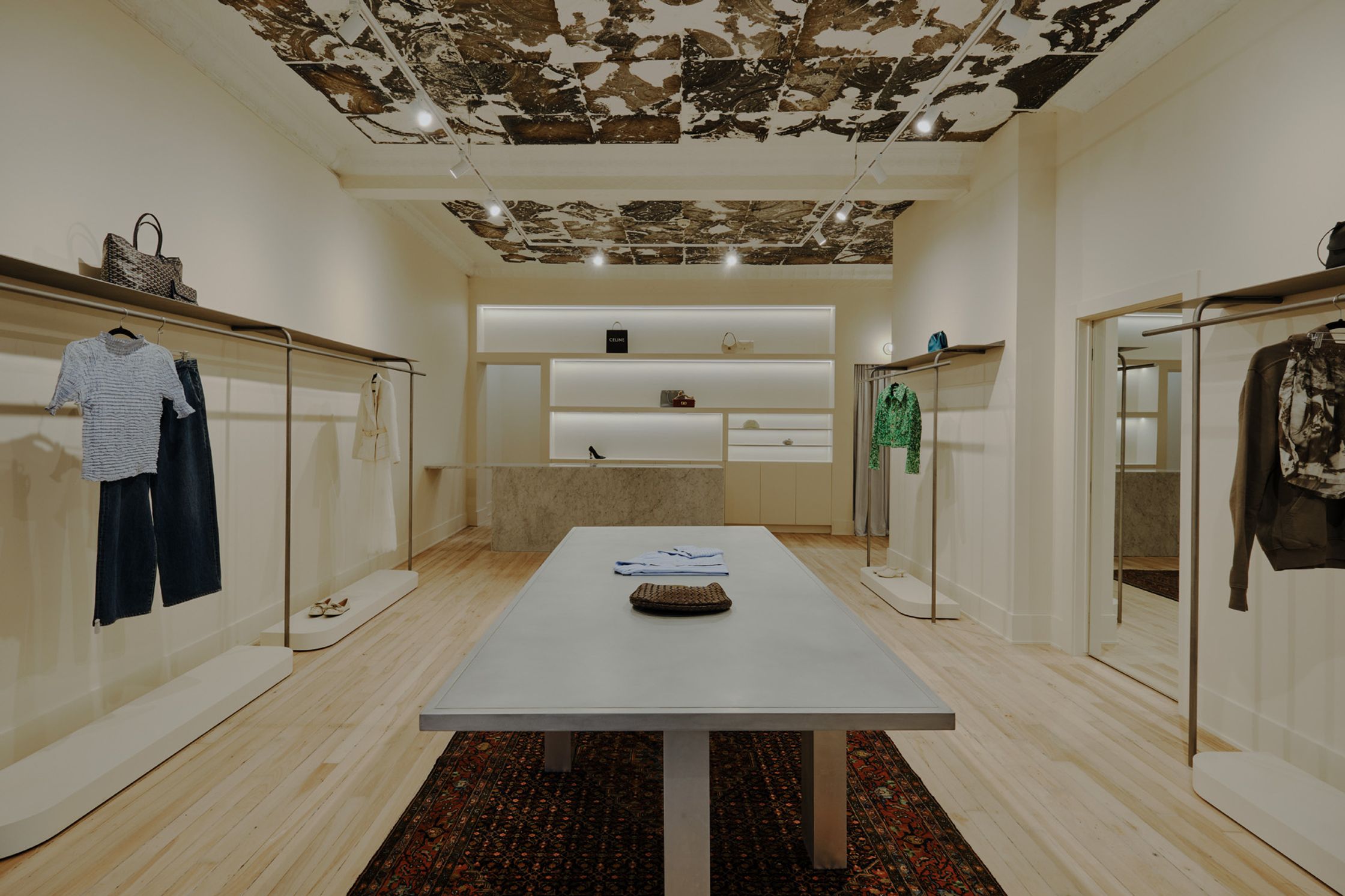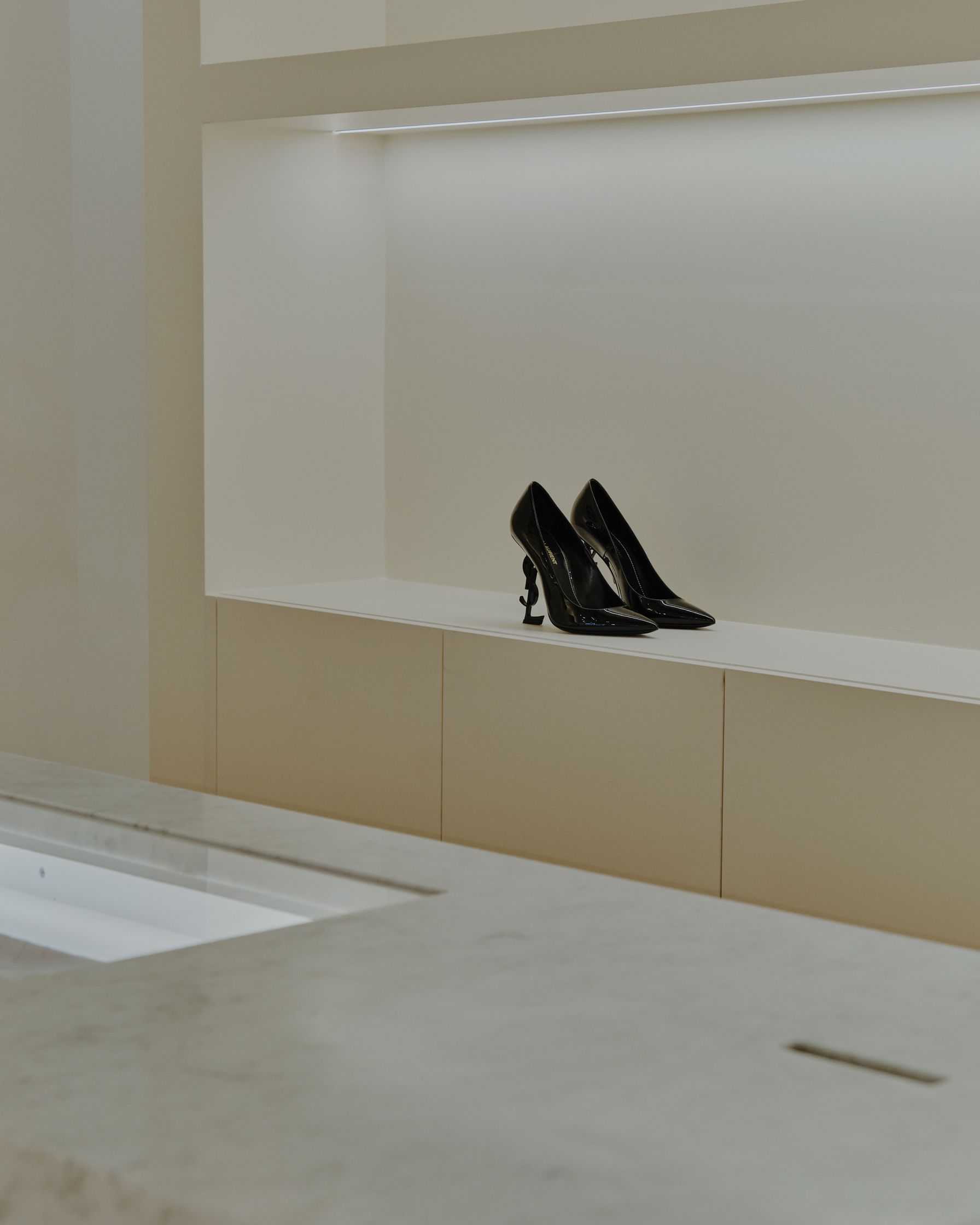The design of Ruse Boutique was guided by the balance between past and present. The space was elevated while preserving its character: maple floors were sanded back to their natural tone, and decorative ceiling cornices retained. As a consignment shop, the challenge was to provide generous display without overwhelming the space. Tall, slender racks, strategically placed mirrors, and custom shelving with integrated lighting created the sense of openness and ease. Collaborations with local designers Clara Jorisch on a custom seating element and Justin Fusaro on the store's metal work grounded the project in craft and detail.